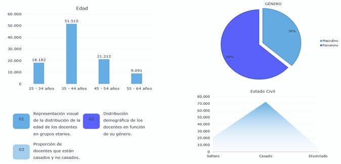 Visión demográfica y social: en el análisis de la muestra conformada por el cuerpo docente de la Universidad Católica de Cuenca, Extensión Cañar, se destaca la predominancia de mujeres, representando el 63.64% del total encuestado. En relación con el estado civil, el 72.73% de los docentes se encuentran casados. El grupo etario más significativo abarca edades entre 35 y 44 años, constituyendo el 51.52% de la muestra. En términos de cargas familiares, la mayoría de los docentes tiene dos, representando el 39.39%. (Figura 1)