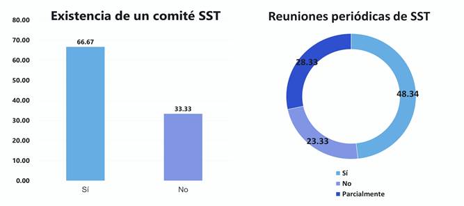 Reuniones periódicas de SST: los resultados de la evaluación sobre la frecuencia de las reuniones periódicas de Seguridad y Salud en el Trabajo muestran que el 48.34% de la muestra indica tener reuniones regulares, el 23.33% señala la ausencia de estas reuniones, y un 28.33% reporta tenerlas de manera parcial. No se registraron datos sobre ausencia (Figura 2).