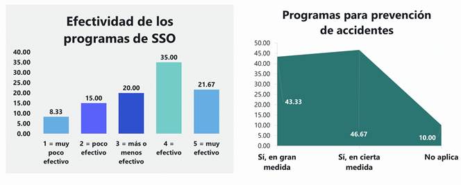 Efectividad de los programas de SSO: los resultados del análisis acerca de la efectividad de los programas de Salud y Seguridad Ocupacional (SSO) indican que el 8.33% de los participantes los considera “muy poco efectivos”, mientras que el 15.00% los evalúa como “poco efectivos”. Un 20.00% los clasifica como “más o menos efectivos”, el 35.00% los percibe como “efectivos”, y el 21.67% los califica como “muy efectivos” (Figura 3).