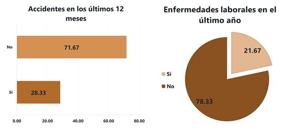Accidentes en los últimos 12 meses / Enfermedades laborales en el último año: los resultados de la evaluación acerca de lesiones o daños debido a accidentes de trabajo en los últimos 12 meses indican que el 28.33% de la muestra ha sufrido o presenciado tales incidentes, mientras que el 71.67% no ha experimentado ningún accidente de este tipo en el mismo período. Mientras que en los resultados de la evaluación sobre la presencia de enfermedades diagnosticadas por un médico atribuidas al trabajo en los últimos 12 meses indican que el 21.67% de la muestra ha sufrido una o más patologías de este tipo. Por otro lado, el 78.33% informa no haber experimentado enfermedades laborales en el mismo período (Figura 4).