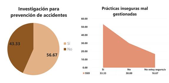 Prácticas inseguras mal gestionadas: los resultados de la evaluación sobre la observación de prácticas inseguras en el lugar de trabajo que no han sido abordadas de forma adecuada (Figura 5), revelan que el 53.33% de la muestra ha observado tales prácticas. En contraste, el 30.00% indica no haber presenciado prácticas inseguras mal gestionadas, y el 16.67% se muestra indeciso/a al respecto. No se registraron datos de ausentismo.