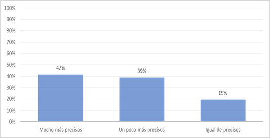 Precisión de datos: el 41.67% de los encuestados calificaron los datos financieros recopilados mediante la integración del Internet de las Cosas (IoT) como mucho más precisos en comparación con los métodos tradicionales. Además, el 38.89% indicó que son un poco más precisos, mientras que el 19.44% considera que son igual de precisos (Figura 1). Estos resultados señalan una percepción generalizada entre los encuestados de que la integración del IoT en la recopilación de datos financieros conlleva una mejora en la precisión en comparación con los métodos tradicionales, aunque hay una minoría que percibe una precisión similar entre ambos enfoques.