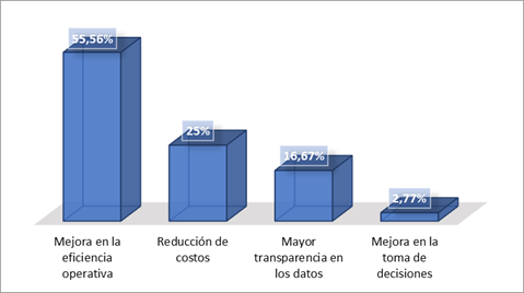 Beneficios de IoT: el 55.56% de las organizaciones encuestadas identifican la mejora en la eficiencia operativa como el principal beneficio experimentado con la integración del internet de las cosas (IoT) en su sistema contable. Además, el 25% menciona la reducción de costos como un beneficio relevante. Por otro lado, el 16.67% destaca una mayor transparencia en los datos como resultado de la integración del IoT, mientras que solo el 2.77% menciona una mejora en la toma de decisiones (Figura 2). Estos resultados argumentan que el sector comercial prioriza la eficiencia operativa y la reducción de costos como los principales beneficios de la integración del IoT en los sistemas contables, con una menor atención hacia la mejora en la toma de decisiones.