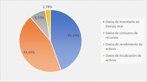 Datos relevantes para decisiones financieras: según las respuestas recopiladas, los encuestados consideran que los datos generados por dispositivos IoT más relevantes para mejorar la toma de decisiones financieras en sus empresas son los datos de inventario en tiempo real y los datos de consumo de recursos, ambos con un 44.44% de frecuencia. Esto indica que la capacidad de monitorear el inventario y el consumo de recursos en tiempo real es fundamental para optimizar las decisiones financieras. Además, un pequeño porcentaje 8.33% menciona los datos de rendimiento de activos, en consecuencia, además se valora la información sobre cómo los activos están funcionando. Solo un 2.78% menciona los datos de localización de activos, lo que indica que este tipo de información es menos relevante en comparación con los otros tipos de datos mencionados (Figura 4). Estos resultados resaltan la importancia de la disponibilidad de datos en tiempo real para mejorar la eficiencia y la precisión en la toma de decisiones financieras en las empresas.