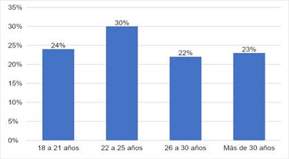 En la figura 2, se observa que el grupo etario de 22 a 25 años fue el que mayor participación tuvo, siendo importante considerar este indicador debido a que muchos de los estudios relacionados con el emprendimiento han afirmado que justamente este grupo ha sido uno de los más proclives a participar en este tipo de actividades económicas. Concordando también con lo expresado por Feijó et al. (2019).