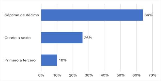 Los resultados evidencian que el 64% de los estudiantes participantes cursan estudios de séptimo a décimo semestre, lo cual también es relevante debido a que se percibe que cuando se encuentran en semestres avanzados, habría mayor propensión a reflejar una intención emprendedora.