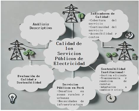 En la figura 2, destacan aspectos como la calidad de los servicios públicos de electricidad, lo cual representa el grado de satisfacción de las necesidades de los usuarios. Además, se mencionan indicadores de calidad, tales como: la cobertura del servicio, la continuidad del servicio y la accesibilidad y los costos. Por otro lado, resaltaron aspectos como la sostenibilidad Institucional, la cual implica la capacidad de las instituciones para operar a largo plazo de manera eficiente y responsable. También se señalan las siguientes dimensiones: gestión eficiente, transparencia, rendición de cuentas y adaptación a cambios y crisis.