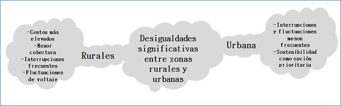 La figura 3 revela que los usuarios rurales enfrentan costos más elevados y menor cobertura. La distancia para emplear las redes principales como internet y la falta de mantenimiento son barreras clave. También, los usuarios experimentan interrupciones frecuentes y fluctuaciones de voltaje. Las zonas rurales enfrentan mayores barreras de acceso, lo que afecta directamente la percepción de la confiabilidad del suministro. Esto se traduce en una brecha significativa respecto a las áreas urbanas. En estas áreas, aunque menos frecuentes, las interrupciones y fluctuaciones generan descontento. Las políticas de sostenibilidad son prioritarias en la gestión eléctrica urbana. Otro factor clave, es el interés creciente por la incorporación de energías renovables, pero su adopción es limitada en áreas rurales.