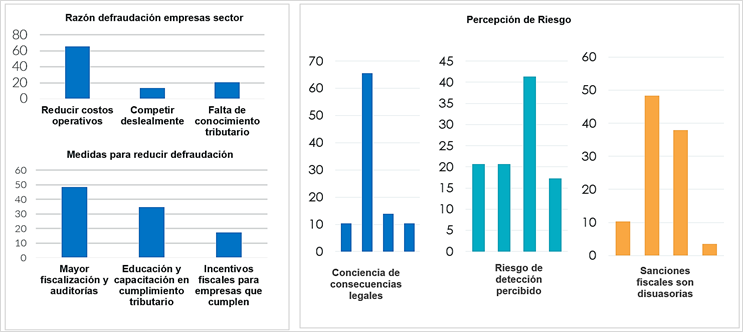 Razón, medidas y percepción de riesgo de defraudación: la información de la figura 1 muestra que las medidas más efectivas para reducir la defraudación tributaria en el sector de reparación de vehículos son, en primer lugar, la mayor fiscalización y auditorías, señalada por el 48.28% de los encuestados, seguida de la educación y capacitación en cumplimiento tributario en 34.48%. También se propone la implementación de incentivos fiscales para las empresas que cumplen en 17.24%.