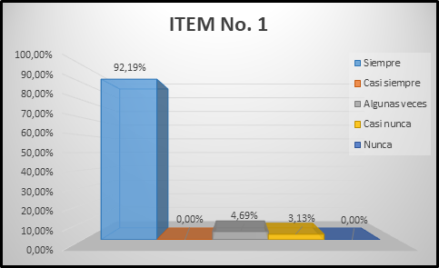 Con relación al ítem N° 4 de la misma dimensionalidad, administración del desempeño por competencias, indicador actitudes, el 81,25% de los participantes afirman que casi siempre son considerados los aspectos que se miden en la evaluación de desempeño por competencias están acordes con las funciones de los puestos de trabajo por cuanto son analizados por el perfil de las actividades que ejercen cada uno de los trabajadores administrativos. Así mismo, en alusión a estas respuestas, el 14,06 % concluyó que siempre son evaluados los empleados acordes a los puestos que ocupan y las funciones que ejercen. A continuación, se detalla gráficamente las respuestas obtenidas en este ítem.