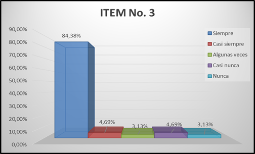 Las alternativas de respuestas de la tabla N° 3, del ítem N° 3, de la dimensión administración del desempeño por competencias, indicador actitudes, el 84,38% opinaron que siempre la evaluación del desempeño puede ser impactada, positiva o negativamente, por elementos intrínsecos del evaluador, ya que en muchas circunstancias quienes son responsables de llevar a cabo esta medición no lo hacen con ética, objetividad, profesionalismo e imparcialidad, lo cual perjudica directamente al trabajador, siendo esto una conducta del antivalor de la que no deben estar presente en la administración pública nacional, por ser esta violatoria y contraria al derecho constitucional que nos asiste como trabajadores.