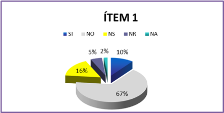 Tal como lo especifica la tabla N° 1, para los efectos del indicador referente al conocimiento técnico del ítem 1, muestra una inexistencias de normas tal cual lo refleja el resultado de los encuestados, dónde alrededor del 67% de las personas afirman que no se cuenta con políticas actualizadas y claras para el proceso reclutamiento y selección por competencias, lo cual no permite llevar a cabo eficientemente este proceso tan esencial para contar con el talento idóneo que ocuparía los cargos vacantes existentes. Así mismo el 16% de la masa trabajadora, comenta que no sabe si la universidad aplica políticas para este proceso, puesto no han podido ser observadas ni verificadas por estos.