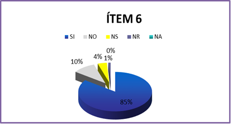 En el ítem 6 de la tabla N° 3 de la dimensión competencias, el indicador actitudes detalla que el 85% de los encuestados afirman que, si están de acuerdo que el proceso de selección sea evaluado el perfil del candidato con relación a la aplicación de las pruebas psicológicas para conocer las capacidades generales del candidato, así como su comportamiento, valores, rasgos, es decir, tener en claro cuáles son las competencias transversales básicas y de valores del aspirante a contratar. Mientras el 10% considera que no es necesario la aplicaron de este instrumento de medición psicológica porque puede resultar discriminatorio para un sector de los candidatos.