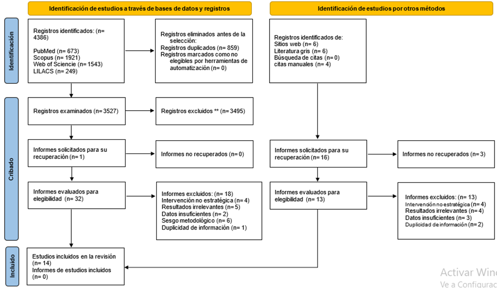 El proceso de búsqueda bibliográfica ofreció de manera preliminar 4386 artículos extraídos de bases de datos, literatura gris y búsquedas manuales. Concluida la primera revisión se eliminaron los registros duplicados y evaluando la pertinencia de los títulos y resúmenes con los objetivos propuestos, fueron excluidos 3495 informes más. Un total de 32 investigaciones con texto completo fueron leídas y evaluadas, incluyéndose 14 definitivamente en el estudio. En la figura 1 se muestra el diagrama de flujo de la revisión sistemática conforme a PRISMA.
