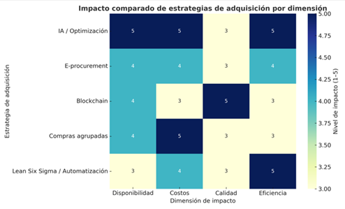 Como se muestra, los enfoques estratégicos de adquisición basados en IA y optimización matemática sobresalen por su alto impacto y consistencia en disponibilidad, costos y eficiencia aunque su contribución a la calidad es moderada. En contraste, el blockchain muestra el impacto más alto en calidad asociado a la capacidad para disminuir falsificaciones e incrementar la trazabilidad. Sin embargo, su rendimiento en eficiencia y costos es un poco limitado.