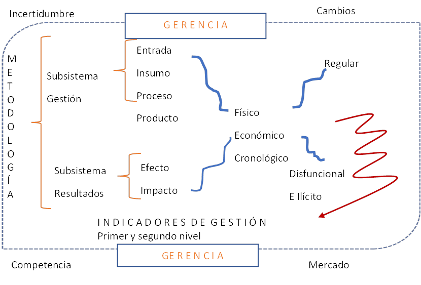 Como se aprecia en la figura 1, la gerencia desempeña un papel activo, dinámico y creativo en la formulación de los indicadores de gestión, aplicando la metodología en medio de un ambiente cambiante, lleno de incertidumbres con mercados altamente exigentes y con una elevada competencia. En este quehacer gerencial, se diseñarán indicadores para los subsistemas de gestión y resultados, entrelazándose con las categorías físicas, económicas y cronológicas. Adicionalmente, contemplarán la característica de la acción, es decir, señalarán si éstos son regulares, disfuncionales e ilícitos.