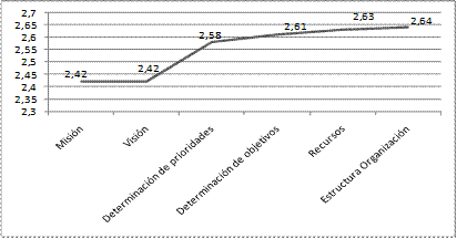 Dentro de este contexto, los resultados de la comparación establecida, donde la prueba de múltiples rangos de Tukey ubicó un subconjunto, basados en la similitud y diferencias de comportamiento entre sus medias, correspondiendo el primero de ellos al indicador “Misión” que obtuvo la calificación más baja con una media = 2,42 ptos, seguido del indicador “Visión” cuya media es = 2,42 ptos. El indicador “Determinación de prioridades” con la media = 2,57 ptos, por su parte el indicador “Determinación de objetivos” cuya media fue de 2,61 ptos; el indicador “Recursos” cuya media fue de 2,63 ptos y por último con la media más alta “Estructura Organización” con una media de 2,64 ptos.