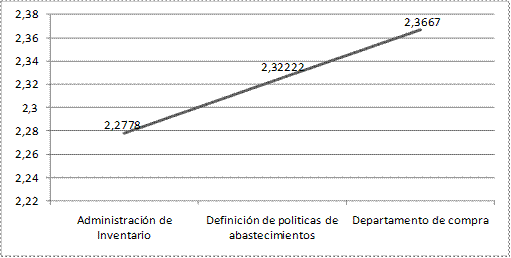 En la tabla 1, se plantean los resultados de la comparación establecida, donde la prueba de múltiples rangos de Tukey ubicó un subconjunto, basados en la similitud y diferencias de comportamiento entre sus medias, correspondiendo el primero de ellos al indicador “Administración de Inventario” que obtuvo la calificación más baja con una media = 2,27 ptos, seguido del indicador “Definición de políticas de abastecimientos” cuya media es = 2,32 ptos; adicionalmente, el indicador “Departamento de compra” con la media = 2,36 ptos.