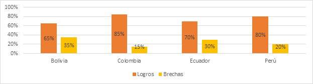 En lo social todos los países presentan dificultades en el acceso a servicios básicos y empleo formal. La gravedad es más alta en Bolivia, Ecuador y Colombia con una calificación de 4 (Guzmán y Cisneros, 2020), mientras que en Perú es moderada, con 3. La falta de datos desagregados, crucial para la planificación de políticas, afecta a Bolivia más que a otros países, con una evaluación de 4, mientras que Ecuador, Perú y Colombia tienen una afectación menor (3); estos desafíos están relacionados con los ODS 1, 8, 10 y 11 (Cajamarca et al., 2024).