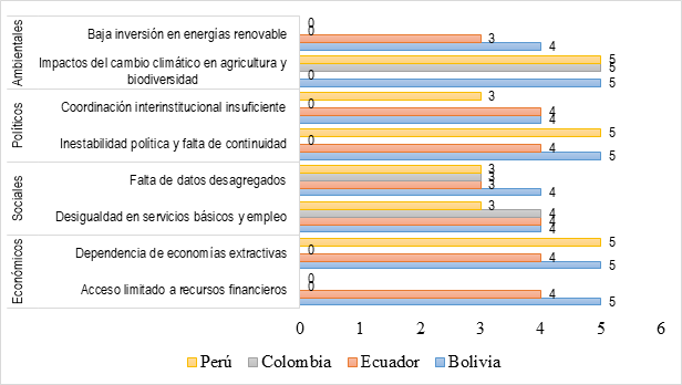 En los aspectos políticos, Bolivia y Perú tienen la mayor inestabilidad, con una calificación de 5, lo que impacta negativamente en la continuidad de las políticas públicas. Ecuador enfrenta este problema en menor medida (4); este análisis está relacionado los ODS 8 y 10. La falta de coordinación interinstitucional es un desafío común, con calificaciones altas en Bolivia y Ecuador (4) y menor en Perú (3); aquí se analizan los ODS 16 y 17. Resalta la importancia de mejorar la articulación entre actores claves para garantizar una implementación eficiente y coordinada de los ODS (Velázquez y Cepeda, 2023).