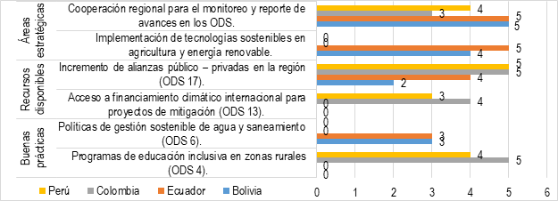 En lo que respecta a los recursos disponibles, el fortalecimiento de las alianzas público – privadas (ODS 17) es notable en Perú y Colombia, cada uno con una calificación de 5, mientras que Ecuador muestra un avance más lento con 4. No obstante, en el acceso a financiamiento climático, Perú (3) y Colombia (4) presentan mayores oportunidades de mejora en comparación con Ecuador y Bolivia, que requieren una atención prioritaria.