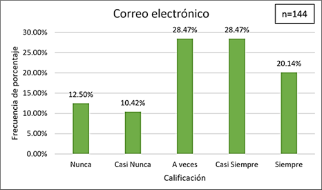 Se observó que el 48,61% de los encuestados manifestó que utiliza siempre o casi siempre el correo institucional como medio de comunicación con la Municipalidad Provincial de Tocache, principalmente para recibir información administrativa y convocatorias laborales. Un 28,47% señaló que lo utiliza a veces, mientras que el 22,92% indicó que nunca o casi nunca recurre al correo electrónico como medio de consulta o interacción institucional (Figura 4).