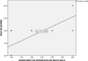 En la Figura 1, se ve la línea de ajuste y que en la nube de dispersión de puntos se puede observar que no es lineal la relación del estrés y la ansiedad. De igual manera en referencia a la nube de puntos se puede establecer la relación con la depresión mostrada en la Figura 2. En la línea de ajuste se puede observar que el estrés tampoco se alinea directamente con la depresión y que son otras variables que lo ocasionan.