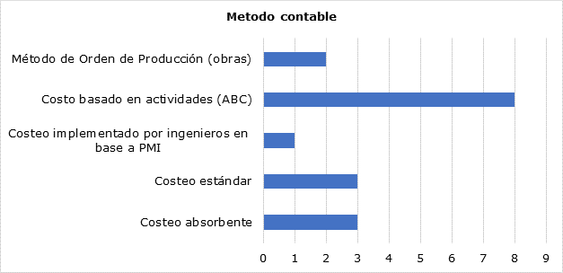 Es relevante señalar que el método basado en PMI no es conocido ni aplicado por contadores, sino por ingenieros civiles especializados en presupuestos. La inclusión de este método en los resultados es fundamental para demostrar la existencia de empresas constructoras que no emplean métodos contables convencionales en el costeo de sus proyectos. En su lugar, optan por técnicas de presupuestación diferentes para determinar los costos asociados.