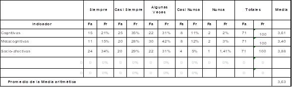 Indicadores: Congnitivas, Metacognitivas, Socio-afectivas