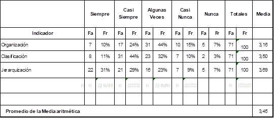 Seguidamente se analizó el indicador “clasificación”, en el cual se observó si en dichas instituciones se busca relacionar los conocimientos adquiridos en el hogar con los de la institución, de allí que se denotó que el 11% opina que siempre se pone en práctica sus conocimientos para apoyar las metas de la institución. Por otro lado, el 44% considera que casi siempre se llevan a cabo, un 32% percibe como que algunas veces, y un 10% como casi nunca. La media calculada del indicador fue de 3,50 que al comparar con el baremo de análisis por media aritmética se categorizó con “presencia”.