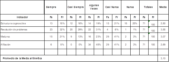 Indicadores: Estructura cognoscitiva, Resolución de problemas, Madurez, Afiliación