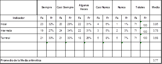 La media calculada del indicador fue de 3,69 que al comparar con el baremo de análisis por media aritmética se categorizó con “presencia”. Al respecto, refiere Morales (2013), sostiene que las estrategias didácticas de enseñanza son el resultado o el proceso de decidir sobre objetivos de la organización, sobre los cambios de estos objetivos y políticas que deben gobernar la adquisición, uso y organización de estos recursos.