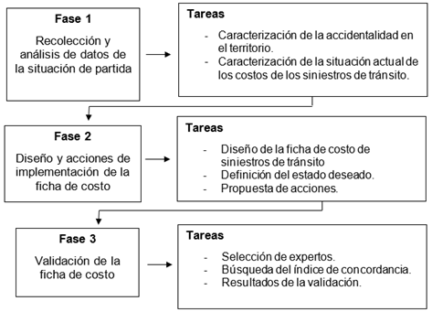 El proceso de investigación (ver figura 1), sigue una secuencia de 3 fases: recolección y análisis de datos de la situación de partida, diseño y acciones de implementación de la ficha de costo y validación de la ficha de costo; lo que contribuye a la gestión de la seguridad vial en Sancti Spíritus.