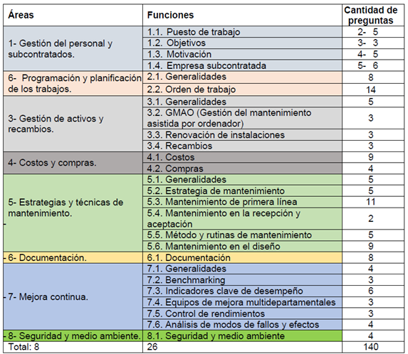 A partir del estudio de varias propuestas de procedimientos para realizar la auditoría de mantenimiento (Marrero Hernández et al., 2019; Parra et al., 2021; Salas y Losada, 2021; Infante Haynes et al., 2022; Villar Ledo et al., 2022), se seleccionó la presentada por Borroto Pentón et al. (2015), la cual está basada en las directrices de la ISO 19011. Sin embargo, se consideró pertinente establecer como alcance de la auditoría, las áreas y funciones definidas por Capelo Guijarro (2017). Este autor propone evaluar el aporte del mantenimiento a la Gestión de activos a partir de ochos áreas o criterios de auditoría (ver tabla 1), definiendo las funciones o subgrupos para cada criterio, así como, una guía a seguir para su evaluación, todo ello tomando como base la norma EN 16 646: 2014.
