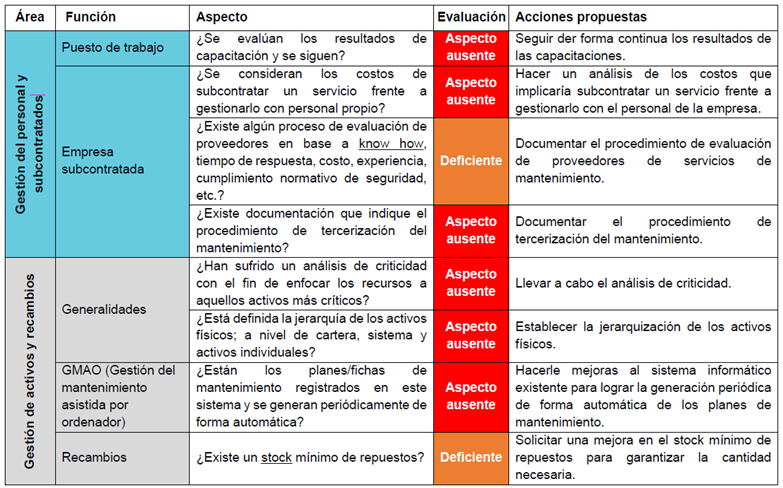 La aplicación del procedimiento seleccionado reveló que el nivel de contribución de la Gestión del Mantenimiento a la Gestión de Activos, conforme a los lineamientos de la norma EN 16646, ha sido evaluado como “Bien”. Sin embargo, se identificaron incidencias negativas significativas en las áreas de Gestión de Activos y Recambios, Costos y Compras, Estrategias y Técnicas de Mantenimiento, Documentación, y Mejora Continua, detectándose un total de 36 oportunidades de mejora.