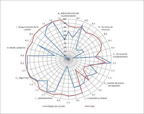 En términos generales, la refinería objeto de estudio muestra un desempeño inferior en comparación con la refinería líder. Esto se debe a su desempeño deficiente en áreas como medio ambiente, servicios de terceros, gestión de piezas de repuesto y administración del mantenimiento (Figura 1).