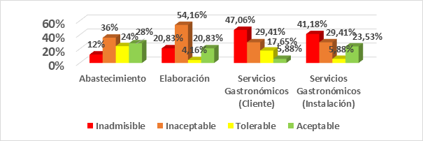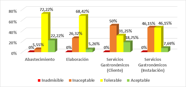 · el comportamiento estimado de las categorías de riesgo tras la implementación de las acciones de mejora es el siguiente: el 30,30 % de los modos de fallo pertenecen a riesgos inaceptables, el 56,06 % son tolerables y el 13,63 % son aceptables. La figura 4 muestra el comportamiento de las diferentes clasificaciones de niveles de riesgo para cada uno de los subprocesos analizados.