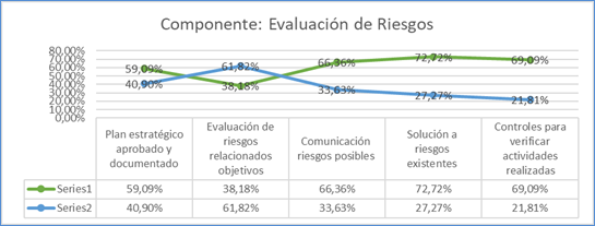 La Figura 2 muestra las consideraciones sobre la existencia y funcionalidad del Plan estratégico aprobado; la evaluación de riesgos relacionados con los objetivos; el funcionamiento de la comunicación de posibles riesgos; la solución que se brinda a los riesgos identificados y sobre la efectividad de los controles para verificar las actividades realizadas.