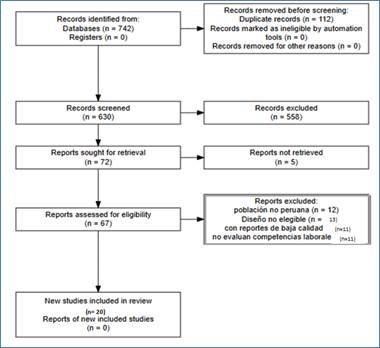 Los registros recuperados se consolidaron y se eliminaron los duplicados antes del cribado. El proceso de selección se desarrolló en dos etapas: lectura de título y resumen, seguida de evaluación del texto completo para verificar elegibilidad. Los recuentos se consignaron en el diagrama PRISMA: se identificaron 742 registros en bases de datos; tras retirar 112 duplicados, se cribaron 630; se excluyeron 558 por título/resumen; se solicitaron 72 informes a texto completo, de los cuales 5 no se recuperaron; se evaluaron 67 informes y se excluyeron 47 con las razones detalladas; se incluyeron 20 estudios en la síntesis cualitativa. Así lo muestra la figura 1.