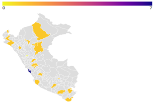 La distribución departamental de los estudios incluidos evidencia la concentración en Lima y presencia puntual en Piura, Huánuco y Junín, además de contribuciones unitarias en otros departamentos. El conteo por departamento permite visualizar brechas geográficas de evidencia y orienta prioridades de investigación y fortalecimiento de competencias en redes de salud fuera de la capital. La lectura del mapa es descriptiva y compara volúmenes de publicaciones por territorio, sin representar niveles de competencia clínica u organizacional. La visualización de la figura 2 complementa la tabla 1 al situar espacialmente los focos de producción y los vacíos regionales en el periodo 2020–2025.