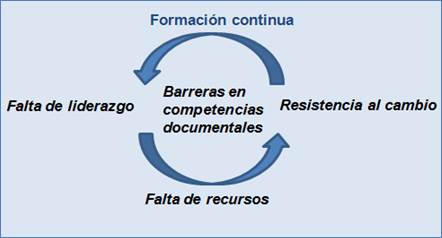 Según la figura 5, a pesar de los claros beneficios del desarrollo de competencias en gestión documental, las organizaciones a menudo enfrentan barreras relacionadas con la resistencia al cambio, la falta de recursos y la falta de un liderazgo claro que impulse estas iniciativas (Díaz et al., 2022; Medina et al., 2024). Reconocer y abordar estas dificultades es fundamental para facilitar una gestión documental efectiva.