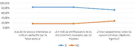 Del cien por ciento de los encuestados, el 83,33 % indicó que las declaraciones tributarias se realizaban de manera coherente con la facturación al momento de la verificación. Además, el mismo porcentaje manifestó que sí efectuaba verificaciones cruzadas de las declaraciones presentadas con los libros auxiliares y los anexos correspondientes a los distintos impuestos, mientras que el 16,67 % admitió no realizar dichas verificaciones de forma adecuada. Por otro lado, el 72,22 % expresó tener conocimiento sobre las reformas tributarias vigentes al momento de la investigación (ver figura 2).