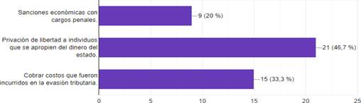 El 46,7% de los encuestados del sector manufacturero consideran que la forma de sanción más óptima es la privación de libertad a individuos que se apropien del dinero del estado, el 33,3% está de acuerdo en que se debería cobrar costos que incurran en la evasión tributaria y el 20% se apliquen sanciones económicas con cargos penales.