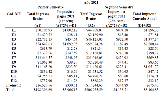Para analizar la variable del Régimen Impositivo para las microempresas (ME) de estudio, se consideró la cuenta del total de ingresos brutos, sin los descuentos y devoluciones, de este se obtiene el 2% y se determina el impuesto a cancelar durante los dos semestres del año 2021, como se muestra en la tabla 1.