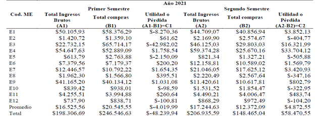 Para analizar el impacto del Régimen Impositivo en las microempresas, se consideraron los datos de compras e ingresos, lo que permitió determinar la utilidad o pérdida de cada empresa durante el año 2021. Los resultados muestran que el 42% de las microempresas (5 empresas) registraron pérdidas en sus actividades comerciales, como se observa en la Tabla 2, mientras que el 58% obtuvieron ganancias, aunque de manera limitada. Esta situación se explica principalmente por las restricciones operativas que enfrentaron la mayoría de las microempresas durante 2021 debido a la pandemia.