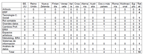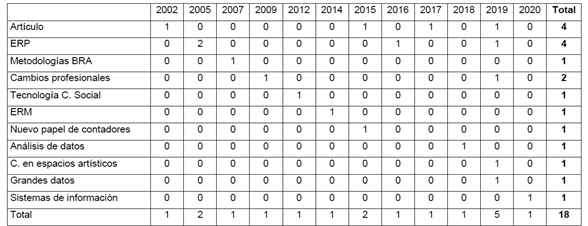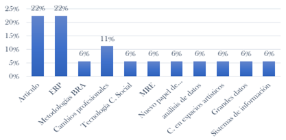 Los temas más comunes abordados por los autores son Enterprise Resource Planning (ERP por sus siglas en inglés, que significa Sistema de Planificación de Recursos Empresariales) y TIC, evidenciando un claro impacto percibido en el campo de la contabilidad. Al mismo tiempo, se identificaron cuatro casos válidos de TIC o sujetos ERP, representando cada uno el 22,2 por ciento y en conjunto el 44 por ciento de la muestra, cerca de la mitad de los casos válidos. Si se consideraran otras formas de TIC en las materias de los estudios accedido, a saber, Big Data y sistemas de información, la conclusión sería que TIC constituyen más de la mitad de las observaciones (Chiu et al., 2019; Heinzelmann, 2017; Yosmary, 2015). Esta evidencia puede presentarse como un indicador de las mutaciones sufridas por la profesión contable y sentidas por los contadores en su diario rutina, algo que algunos autores vienen subrayando (Borisova Bekhteneva, 2015; Circa et al., 2015; Durán, 2015; Pervan y Dropuliÿ, 2019).