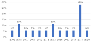 Figura 4. Porcentaje de artículos en cada categoría de la variable año.