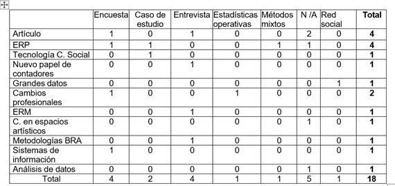 Es importante señalar en los datos que la mayoría de las observaciones indican el uso de métodos cualitativos de recogida de datos en los estudios que forman parte de la muestra analizada. Esta evidencia apunta a la importancia de acceder al tema de manera exploratoria con un análisis profundo. La cantidad de observaciones donde la investigación recurrió a datos cualitativos (enfoques de recolección, encuestas y entrevistas), representan un 44 por ciento de relevancia hacia la idea de analizar el tema, comprendiendo las percepciones de las personas en los procesos que se relacionan con la tecnología y contabilidad.