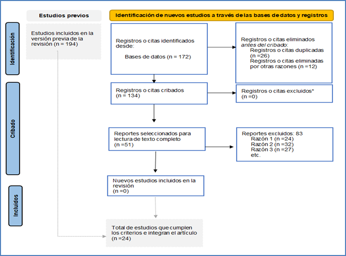 El proceso de selección inició con 194 estudios sobre la temática. El diagrama de flujo PRISMA con sus cuatro fases se muestra en la Figura 1.