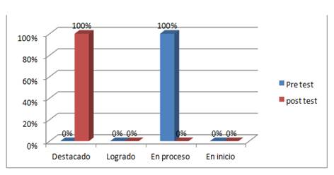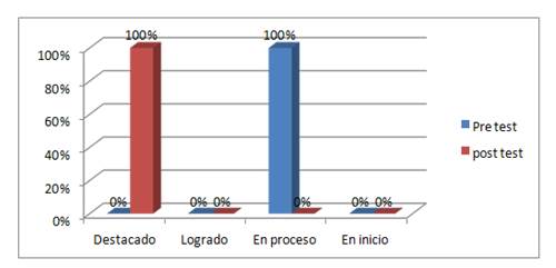 De acuerdo con los resultados de la figura 3, se observa en el grupo experimental que, en el pre-test, para medir la dimensión: prácticas profesionales, el 100 % de estudiantes de educación superior se encuentran en el nivel de proceso; dicho grupo participó en el taller aplicando la variable independiente del Pensamiento de Diseño, y después de 3 meses, al desarrollar el pos-test se observó un cambio favorable porque el 100 % de los participantes se ubicaron en el nivel destacado.